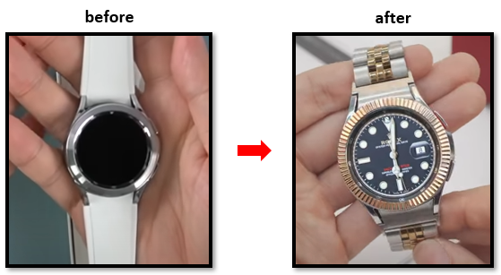 아래 사진은 갤럭시 워치 4 클래식을 롤렉스 시계처럼 튜닝한 사진입니다. 스트랩과 베질은 오픈마켓에서 쉽게 구매할 수 있고 워치 페이스는 스토어에서 다운 가능합니다.