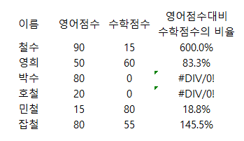 영어점수를 수학점수로 나눴더니 수학 점수를 보지 못한 박수와 호철은 #DIV/0!라는 에러 메시지가 뜬다.