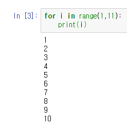 for와 range함수를 조합하여 1부터 10까지 출력해보았습니다.