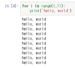 이번에도 for와 range함수를 조합으로 hello, world를 10번 출력해 보았습니다.