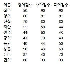 철수부터 민혁까지 영어점수 데이터를 가져왔습니다.