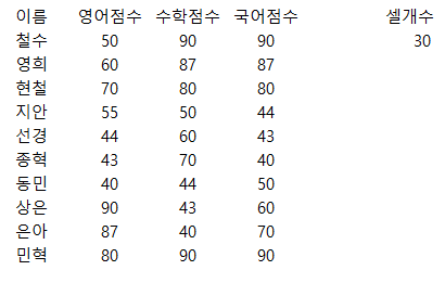 만약 영어점수와 수학 점수, 국어 점수의 셀 개수를 알고 싶다고 가정하고 count함수를 사용해보겠습니다.