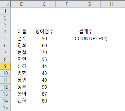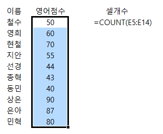 셀 개수를 구하기 위해 count함수가 사용되었고, 영어점수에서 국어 점수까지 범위가 설정된 것을 볼 수 있습니다.