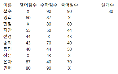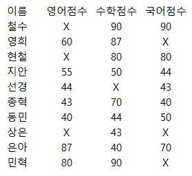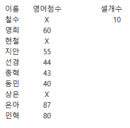 철수와 현철 그리고 상은이는 영어시험을 보지 못해 X로 표기가 되어있는데요.