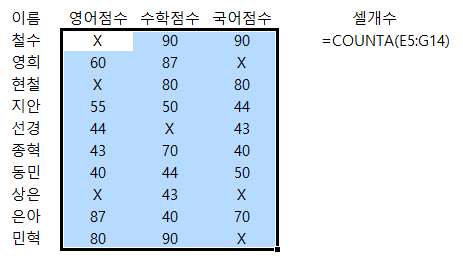counta함수 안에 영어점수의 범위가 지정된 것을 확인하실 수 있습니다.