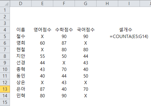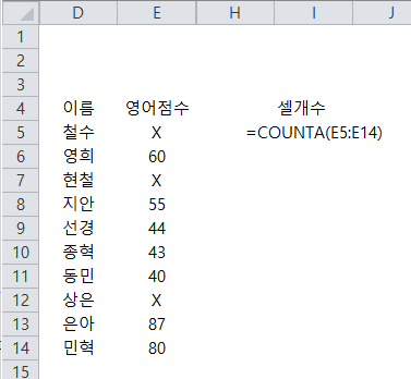 영어시험 대상자가 총 몇명인지 궁금해하는 상황이라 가정해보고 counta함수를 이용하여 셀 개수를 구해보겠습니다.
