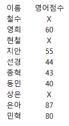 철수부터 민혁까지 영어점수표를 가져와봤습니다.