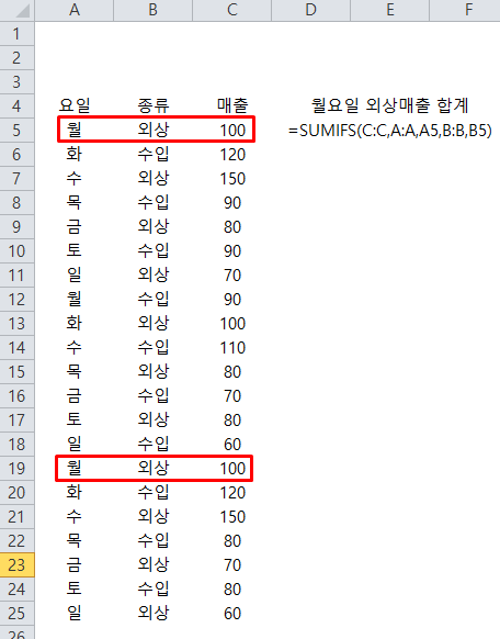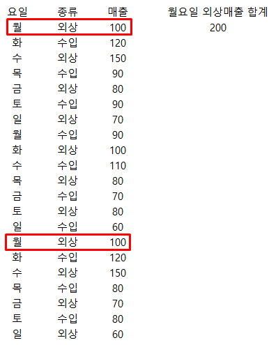 SUMIFS함수를 사용하여 월요일의 외상매출 합계를 구하였더니 200이 나왔습니다.