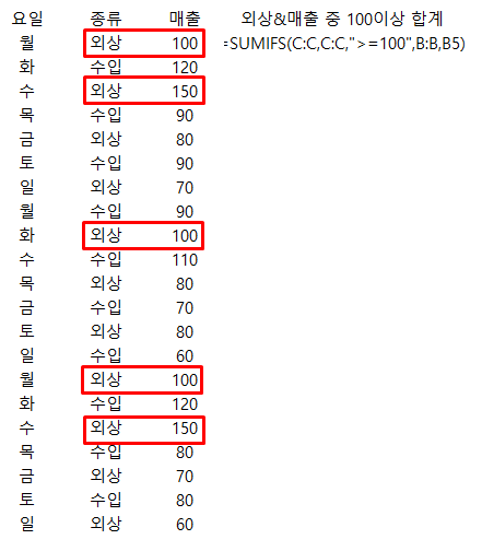 다음은 SUMIFS함수와 비교 연산자를 사용하여 외상&매출 중 100 이상의 합계를 구해보겠습니다.