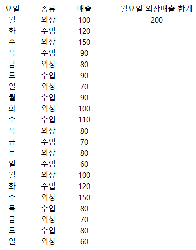 월요일 & 외상의 매출 합계가 200인 것을 확인할 수 있습니다.