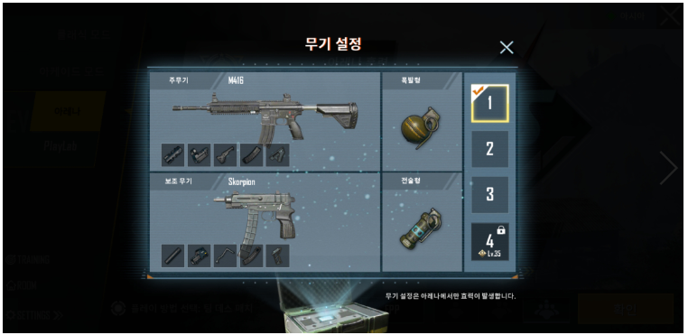 아레나 훈련의 경우, 총을 자유롭게 선택할 수 있으며, 그외 모드는 서바이벌 레벨에 따라 선택 가능합니다.
