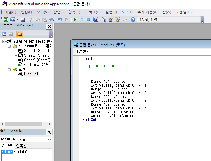 Module 1을 더블클릭하면 아래와 같은 VBA코드 창이 생성됩니다.