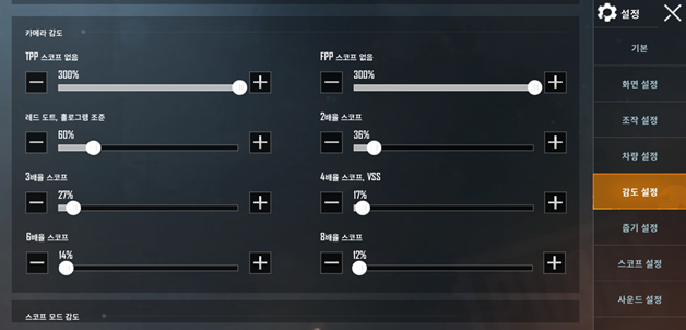 감도설정감도 설정 전 모두 50%로 맞추시고 게임으로 돌아가 조준사격을 해보고 불편하다면 다시 감도 설정으로 돌아와 조금씩 낮추거나 높이는 방법으로 설정해주시면 되겠습니다.