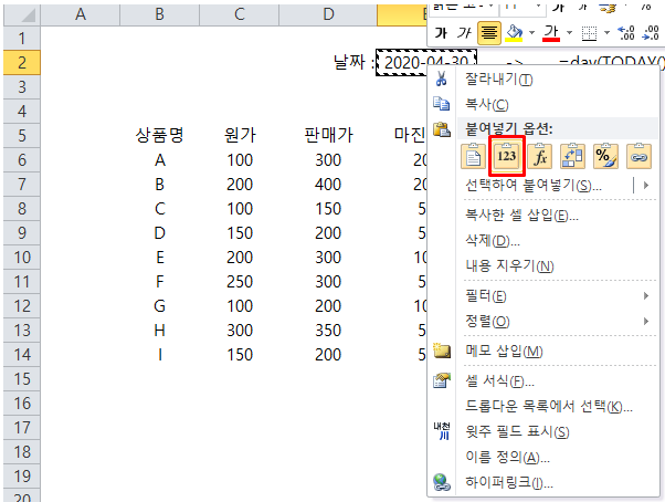 today함수 사용시 주의점은 today함수 특성상 동적으로 업데이트가 되기 때문에 만약 날짜를 고정시키고 싶다면 복사 후 값으로 붙여 넣기를 통해 고정을 시켜줘야 합니다.