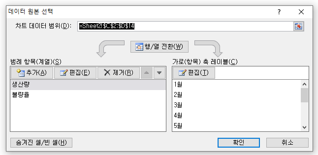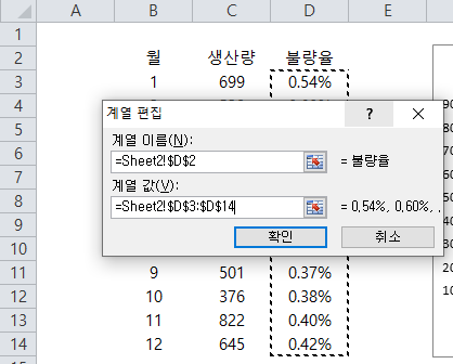 범례 항목(계열)(S)에 불량률이 추가된 것을 확인하고 확인을 눌러줍니다.