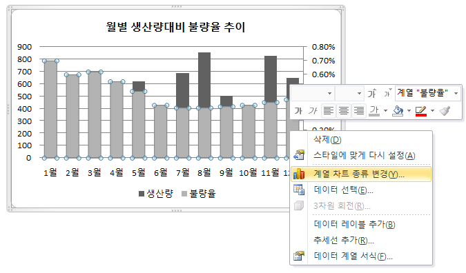 그래프상 불량률을 선택하고 마우스 우클릭을 통해 계열 차트 종류 변경을 눌러줍니다.