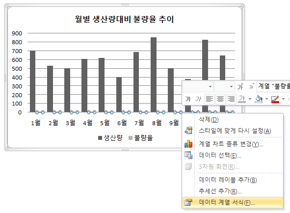 그래프상 불량률을 선택하고 마우스 우클릭을 통해 데이터 계열 서식을 선택해줍니다.