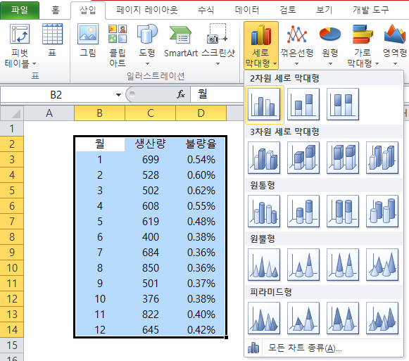 생산량과 불량율을 범위로 지정하고, 2차원 새로 막대형 그래프로 만들어보겠습니다.