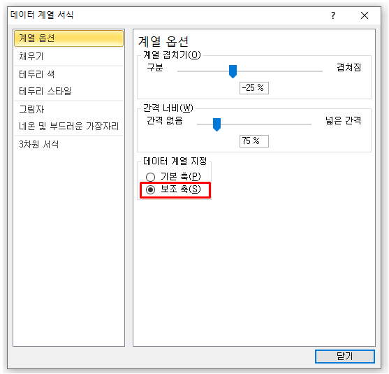 데이터 계열 서식 -> 계열 옵션 -> 보조 축 체크(빨간색 테두리)를 선택 후 닫기를 눌러줍니다.