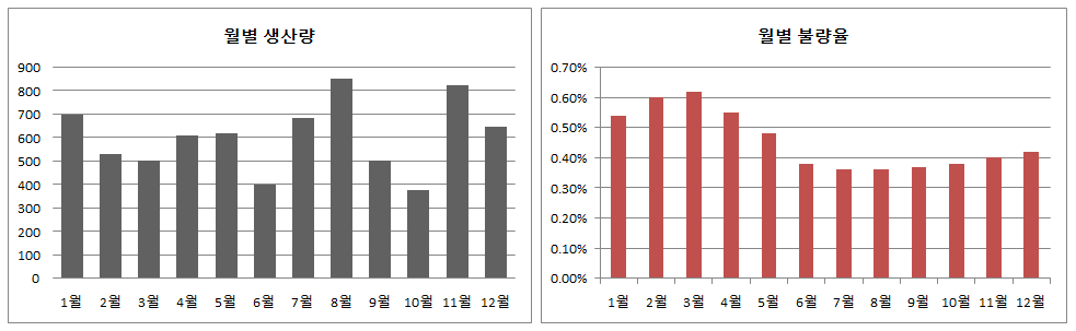 월별 생산량과 불량율에 대한 데이터를 가져왔습니다.