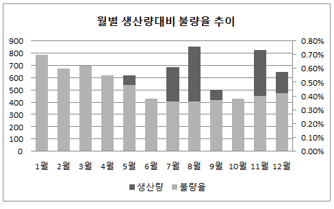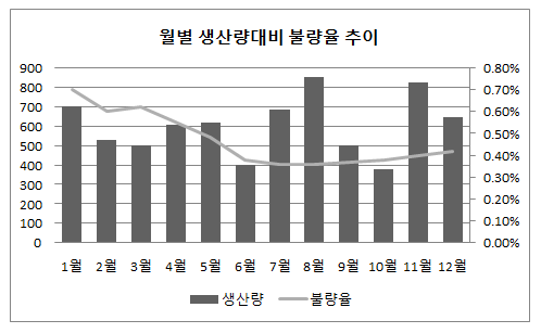 생산량과 불량율의불량률의 크기가 차이가 나서 그래프상으로 불량률의 추이가 확인이 안 됩니다.