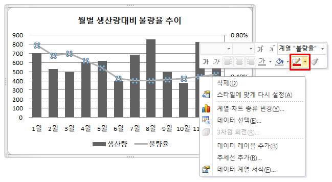 그래프상 불량률을 선택하고 마우스 우클릭해줍니다.