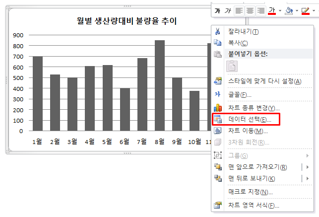 보조축을 추가할 그래프를 마우스 우클릭하여 데이터 선택을 눌러줍니다.