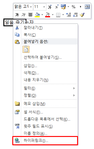 해당 셀에 원하는 텍스트를 작성하고 마우스 우클릭을 하면 맨 밑에 하이퍼링크라는 메뉴가 있습니다.