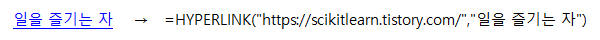 하이퍼링크 함수를 통해 링크를 걸어보니 파란색 글씨에 밑줄이 그어진 것을 확인할 수 있습니다.