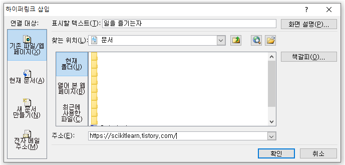 하이퍼링크를 클릭하면 아래와 같은 창이 열립니다.