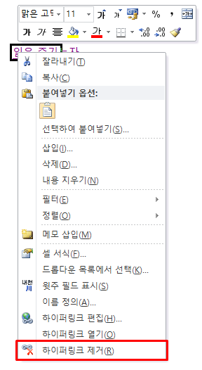 해당 셀의 마우스 우클릭을 하면 맨 밑에 하이퍼링크 제거라는 메뉴가 있습니다. 이 메뉴를 클릭하면 하이퍼링크가 삭제되는 것을 확인할 수 있습니다.