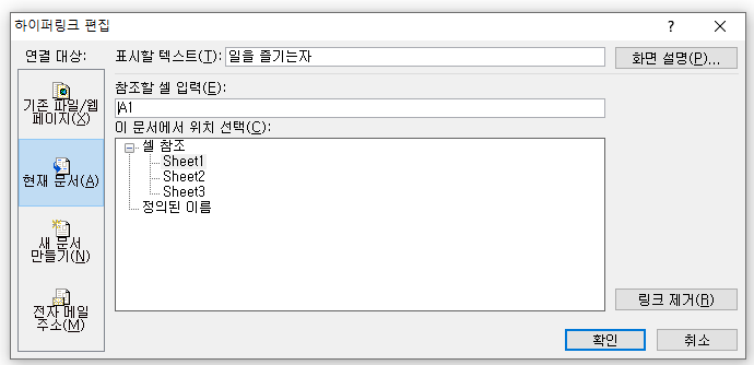 하이퍼링크를 클릭하면 아래와 같은 창이 열립니다.
